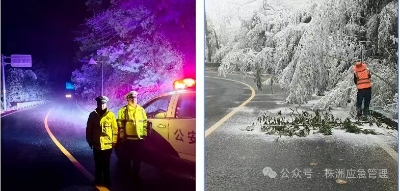 1月21日凌晨至清晨,炎陵县交警大队在全县各个易结冰路段巡逻,并在各路段设立警示标牌;县交通事务中心开展抗冰除雪应急响应,对S204线洒融雪剂,清除倒伏竹木。