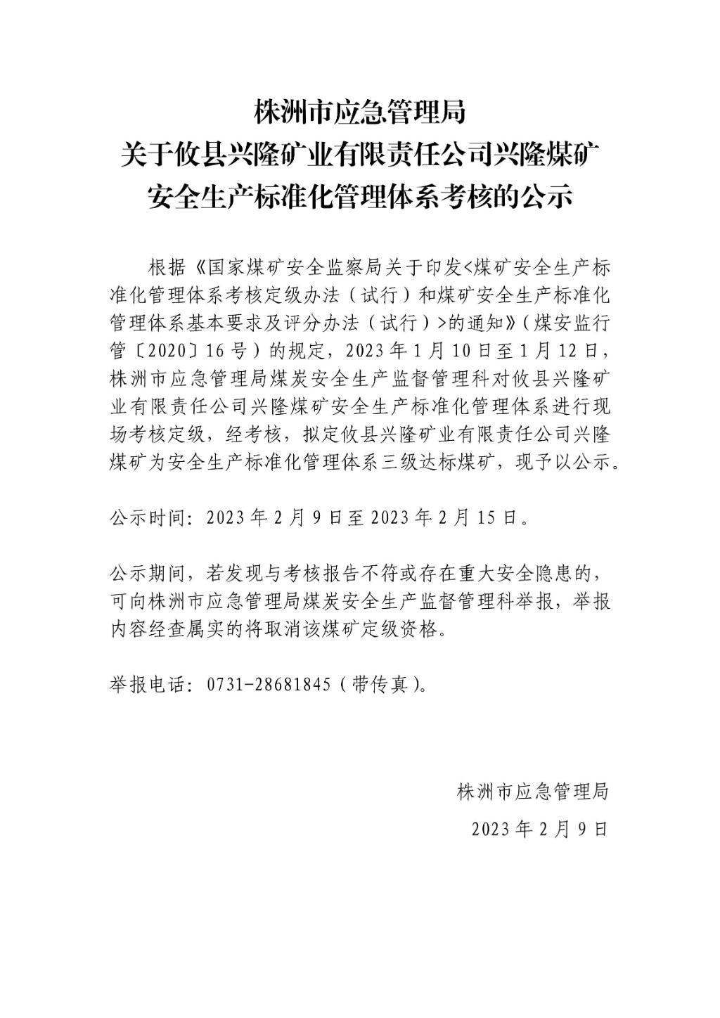 关于攸县兴隆矿业有限责任公司兴隆煤矿安全生产标准化管理体系考核的公示_01