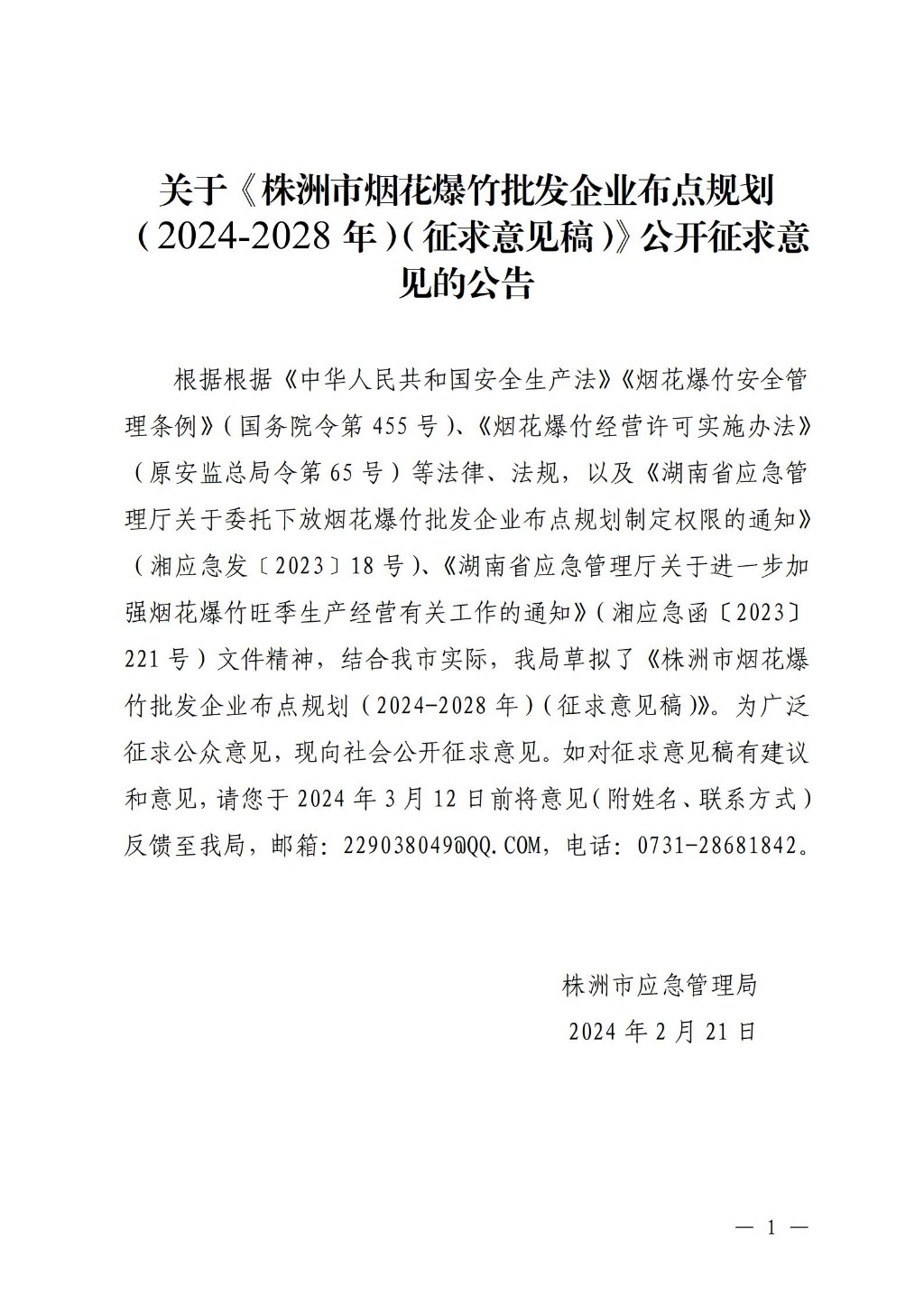 关于《株洲市烟花爆竹批发企业布点规划(2024-2028年)(征求意见稿)》公开征求意见的公告
