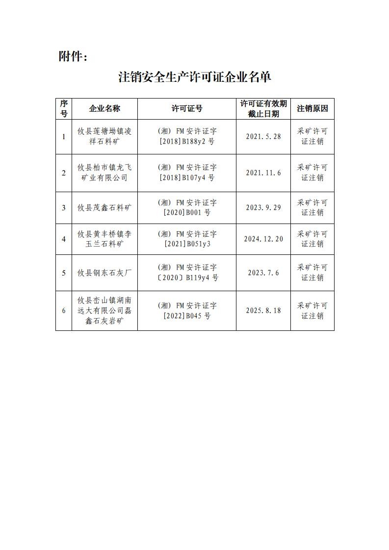 关于注销攸县莲塘坳镇凌祥石料矿等6家非煤矿山企业安全生产许可证的公告