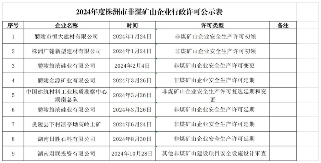 2024年度株洲市非煤矿山企业行政许可公示表