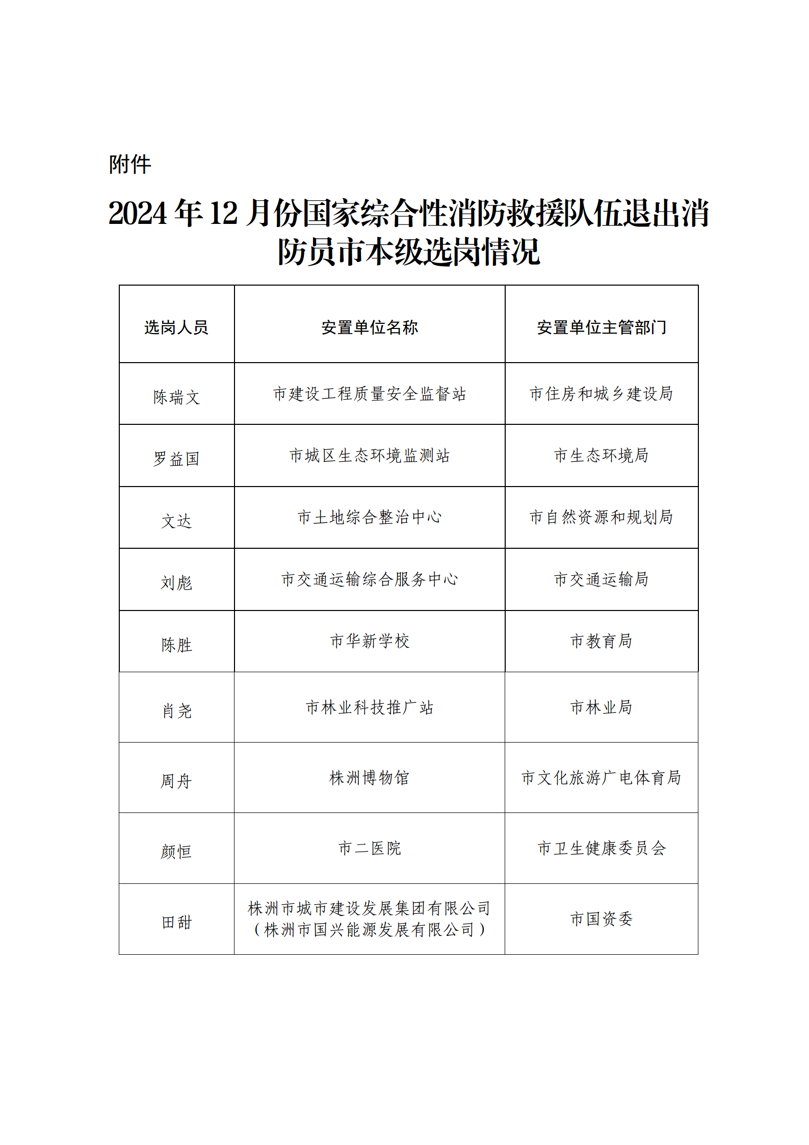 根据《国家综合性消防救援队伍退出消防员安置办法(试行)》(国办发〔2024〕45号)《湖南省国家综合性消防救援队伍退出消防员安置工作方案》(湘应急联发〔2025〕2号)和《关于印发株洲市国家综合性消防救援队伍退出消防员安置有关文件的通知》(株应急联发〔2025〕1号)等文件要求,现将2024年12月份国家综合性消防救援队伍退出消防员市本级选岗情况给予公示。