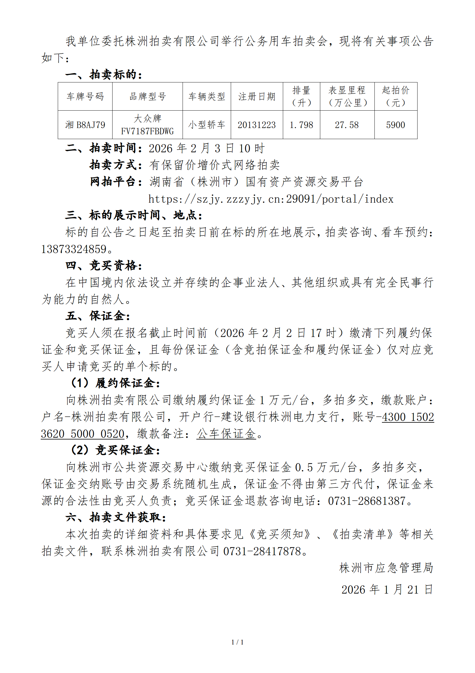 株洲市公务用车拍卖公告