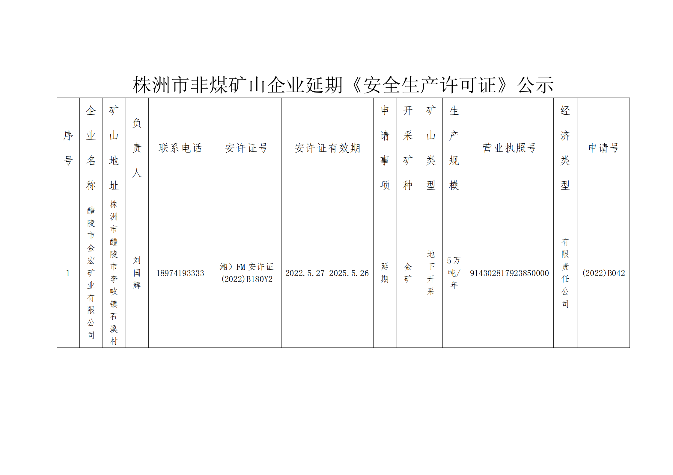 株洲市非煤矿山企业延期《安全生产许可证》公示