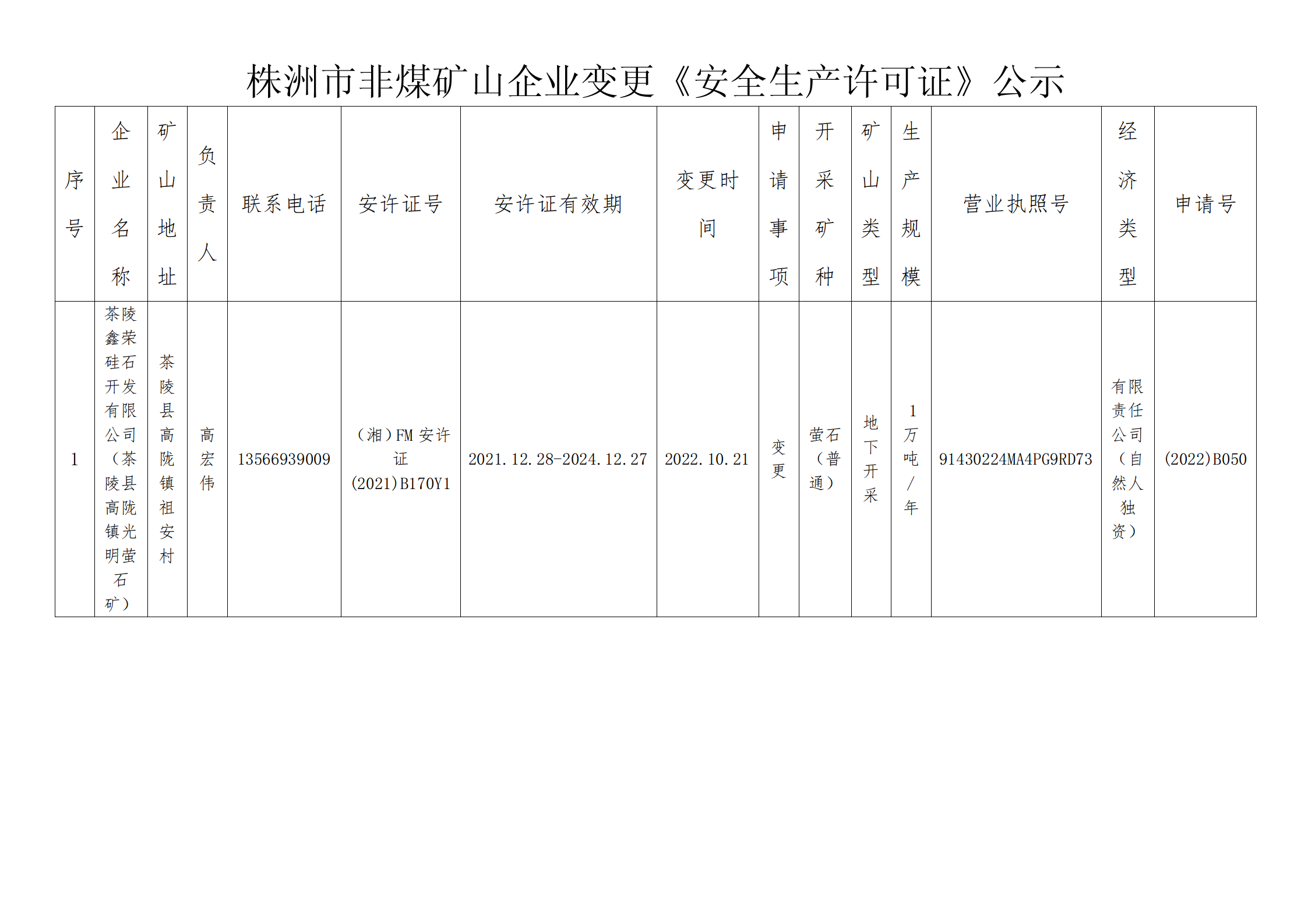 株洲市非煤矿山企业变更《安全生产许可证》公示