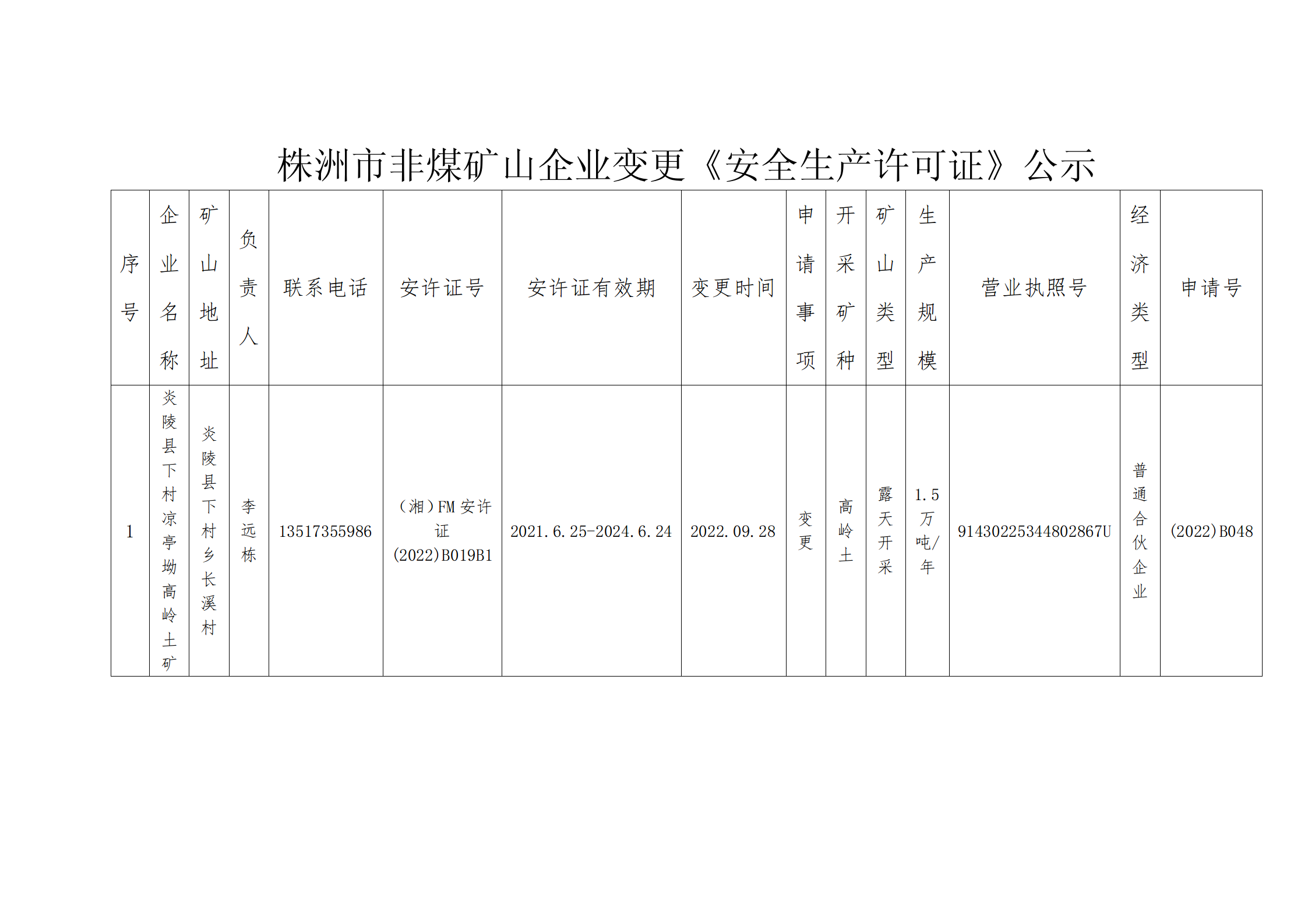 株洲市非煤矿山企业变更《安全生产许可证》公示
