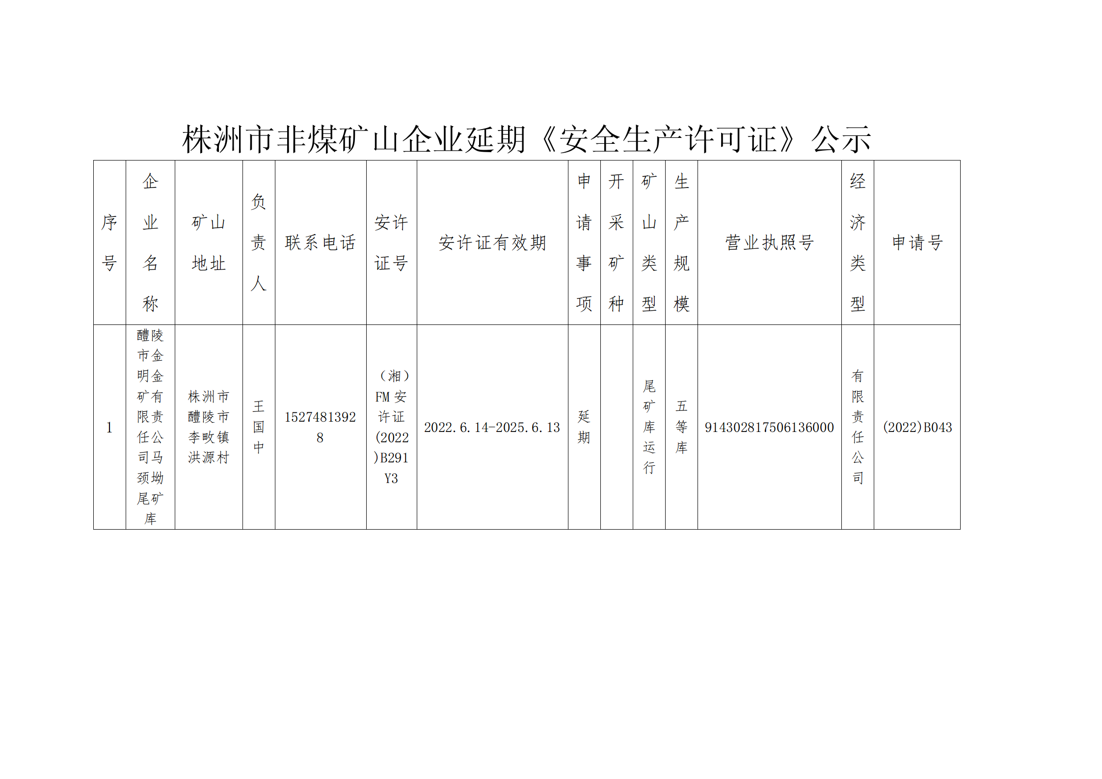 株洲市非煤矿山企业延期《安全生产许可证》公示