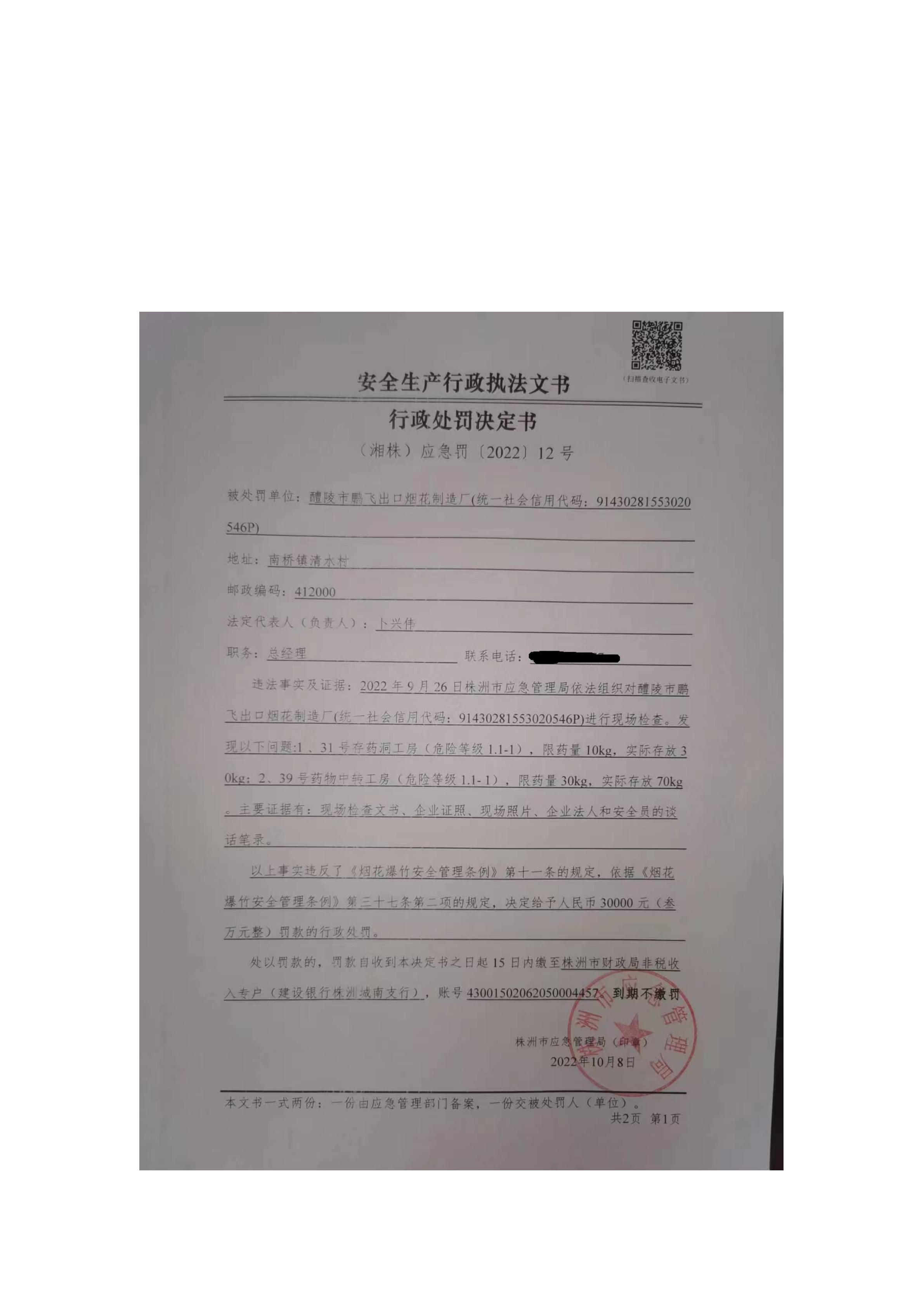 醴陵市鹏飞出口烟花制造厂作业不符合国家标准案