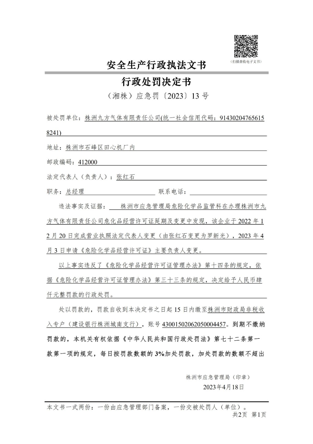 株洲九方气体有限责任公司未按规定申请主要负责人变更案
