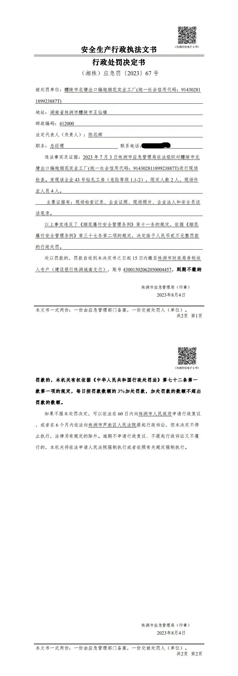 醴陵市北塘出口编炮烟花实业工厂行政处罚决定书