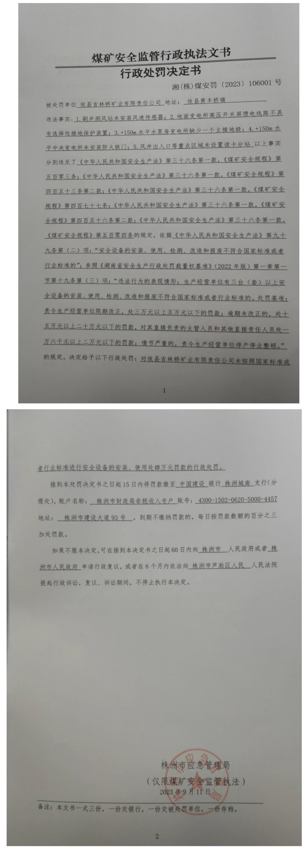 攸县吉林桥矿业有限责任公司行政处罚决定书