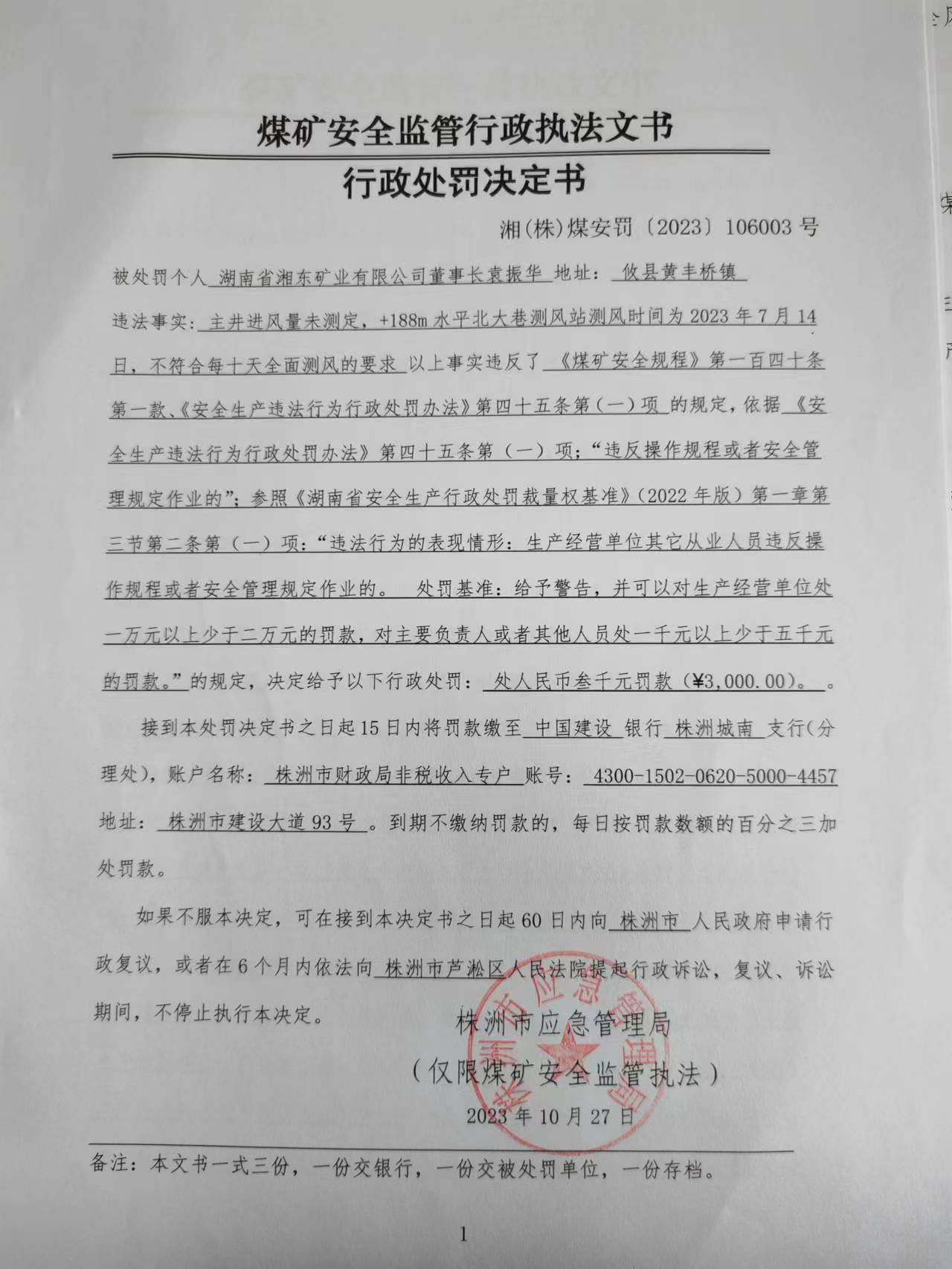 湖南省湘东矿业有限公司行政处罚决定书(对董事长)