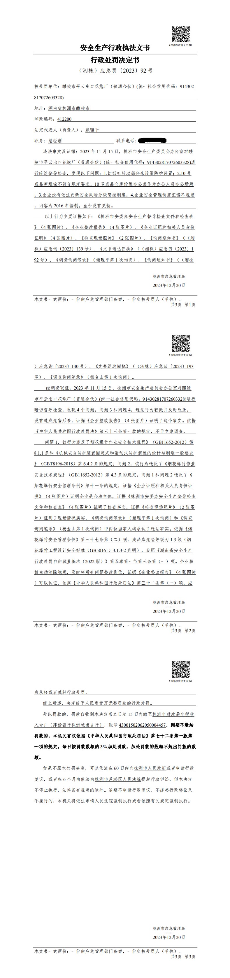 醴陵市平云出口花炮厂(普通合伙)行政处罚决定书