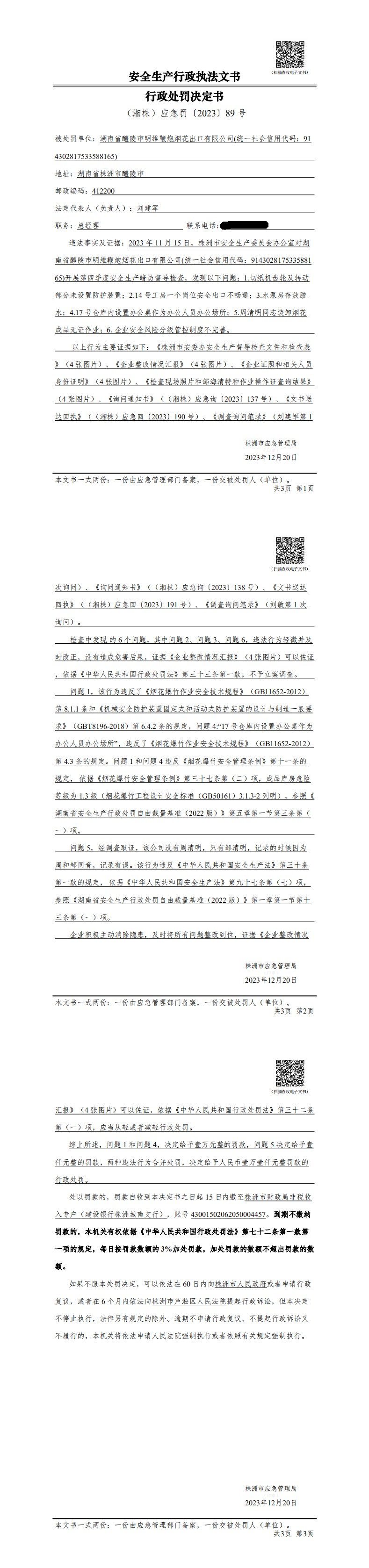 湖南省醴陵市明维鞭炮烟花出口有限公司行政处罚决定书