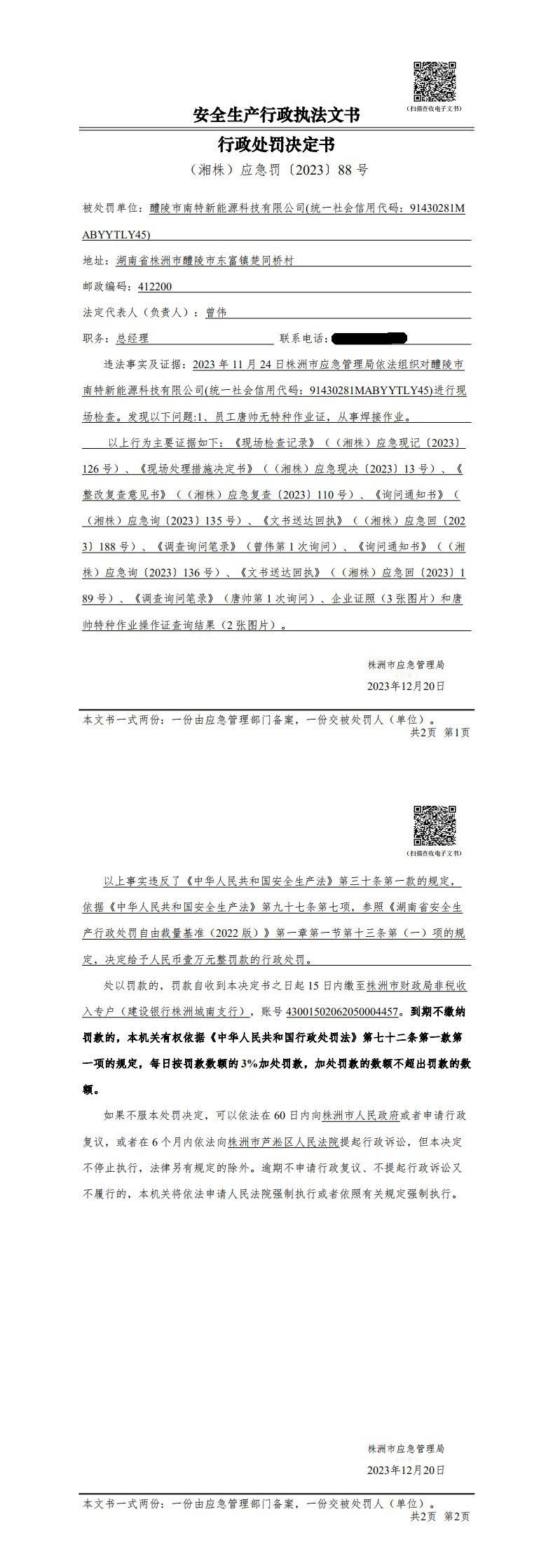 醴陵市南特新能源科技有限公司行政处罚决定书