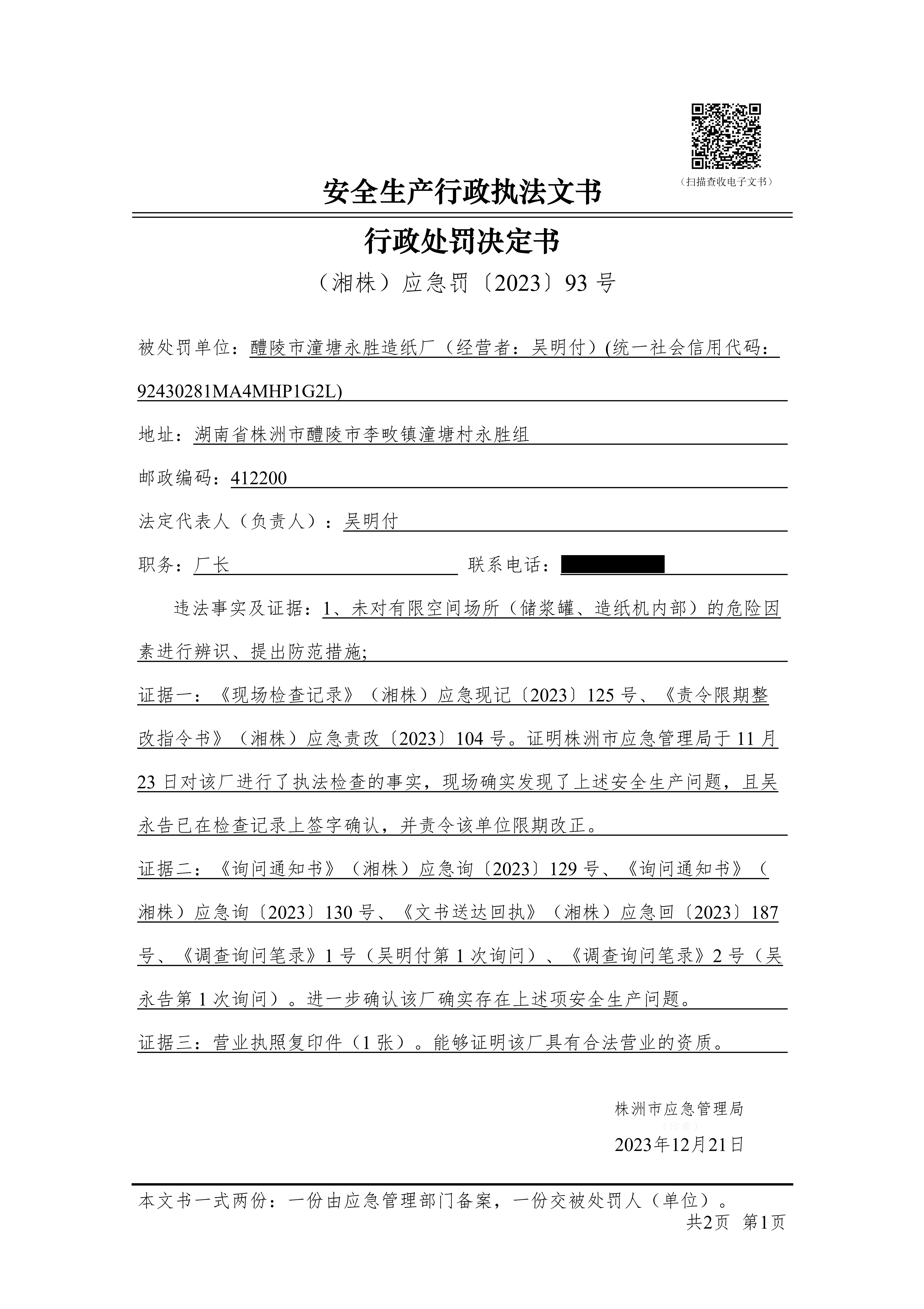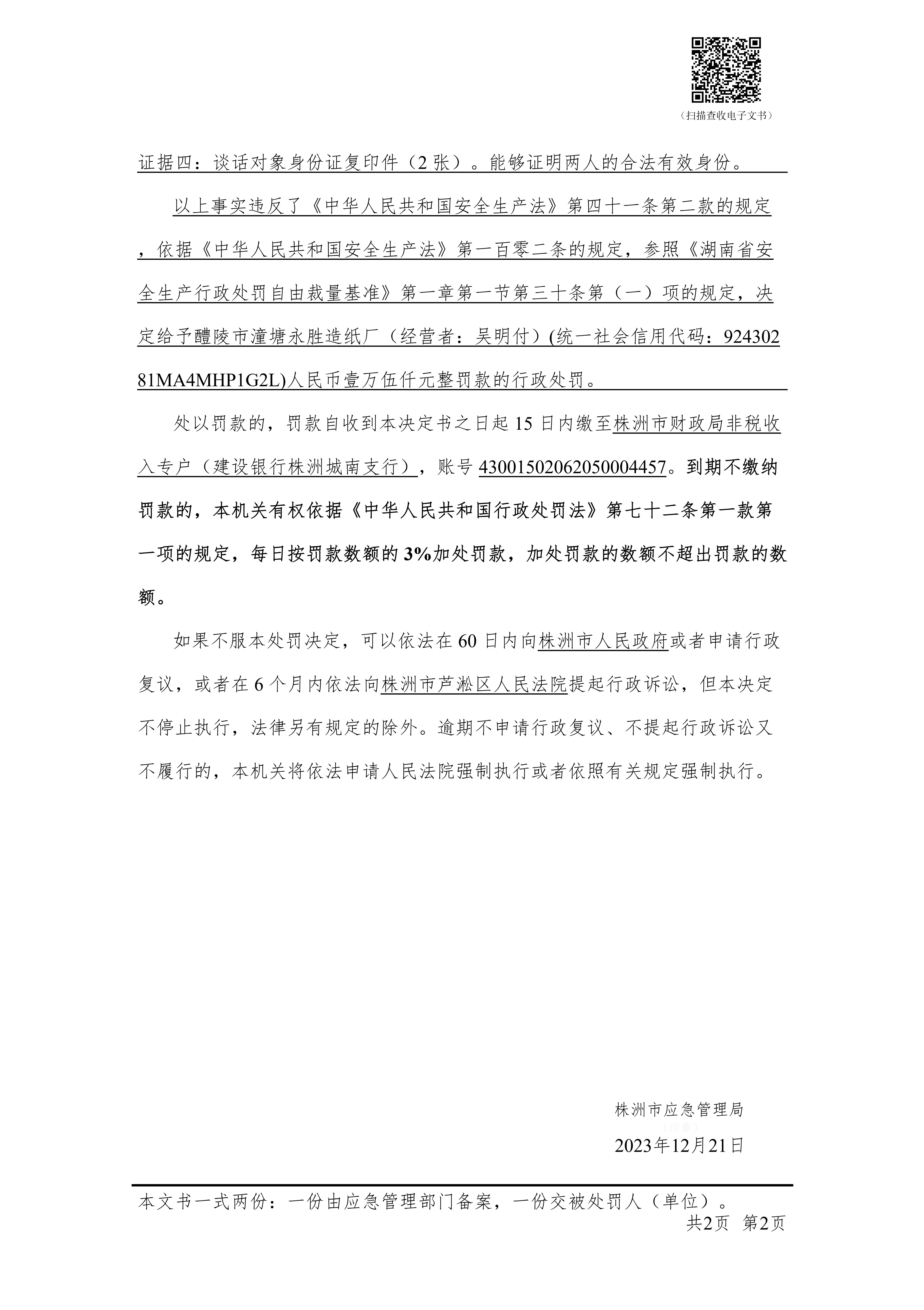 醴陵市潼塘永胜造纸厂行政处罚决定书