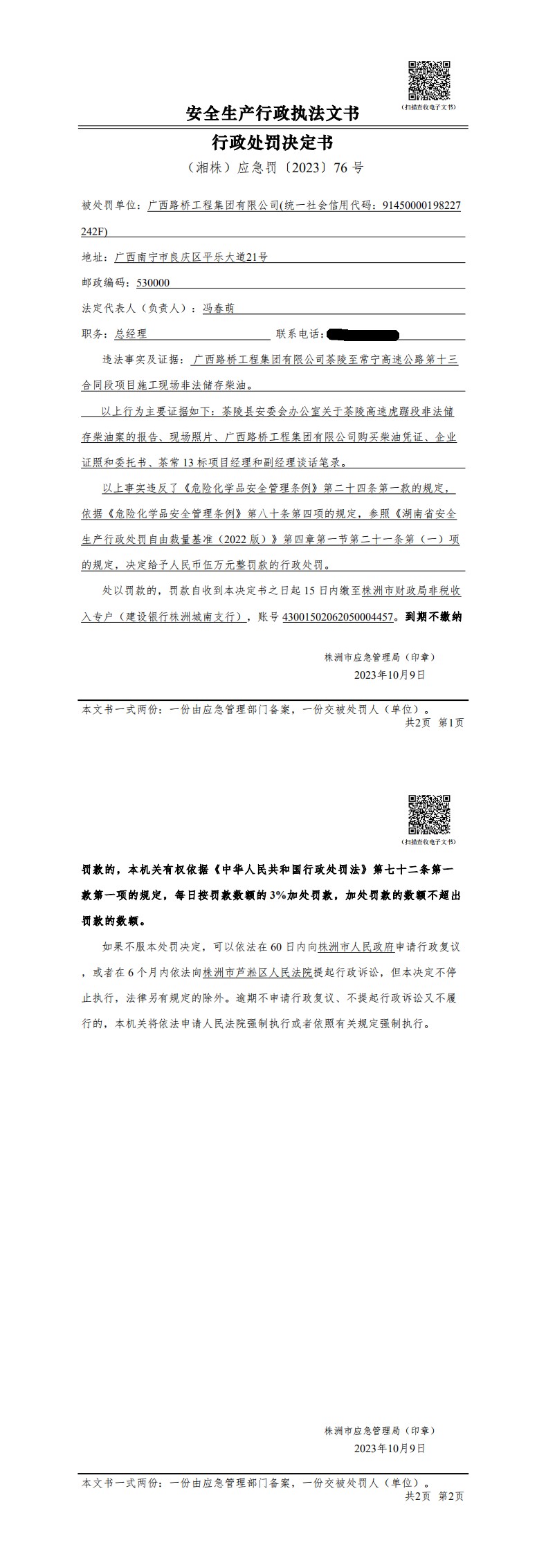 广西路桥工程集团有限公司行政处罚决定书