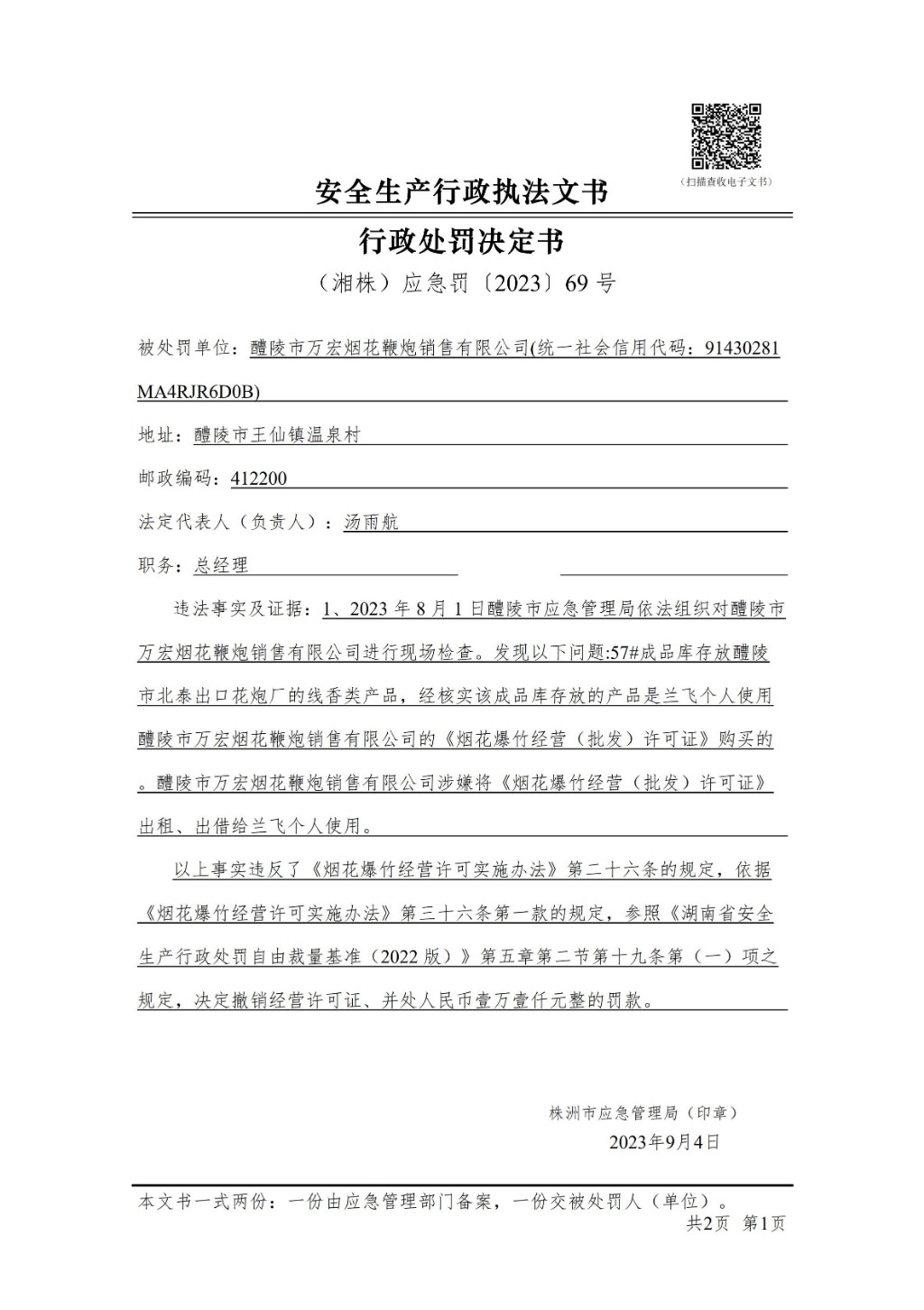 醴陵市万宏烟花鞭炮销售有限公司行政处罚决定书