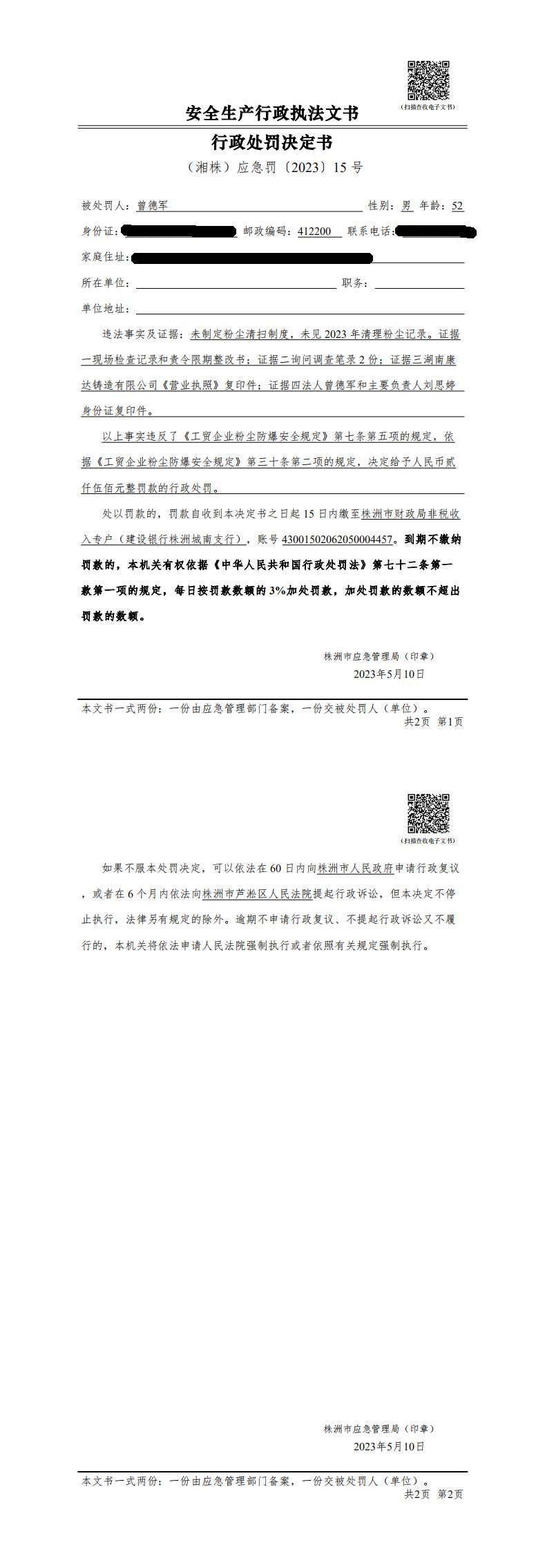 醴陵康达铸造有限公司(对个人)行政处罚决定书