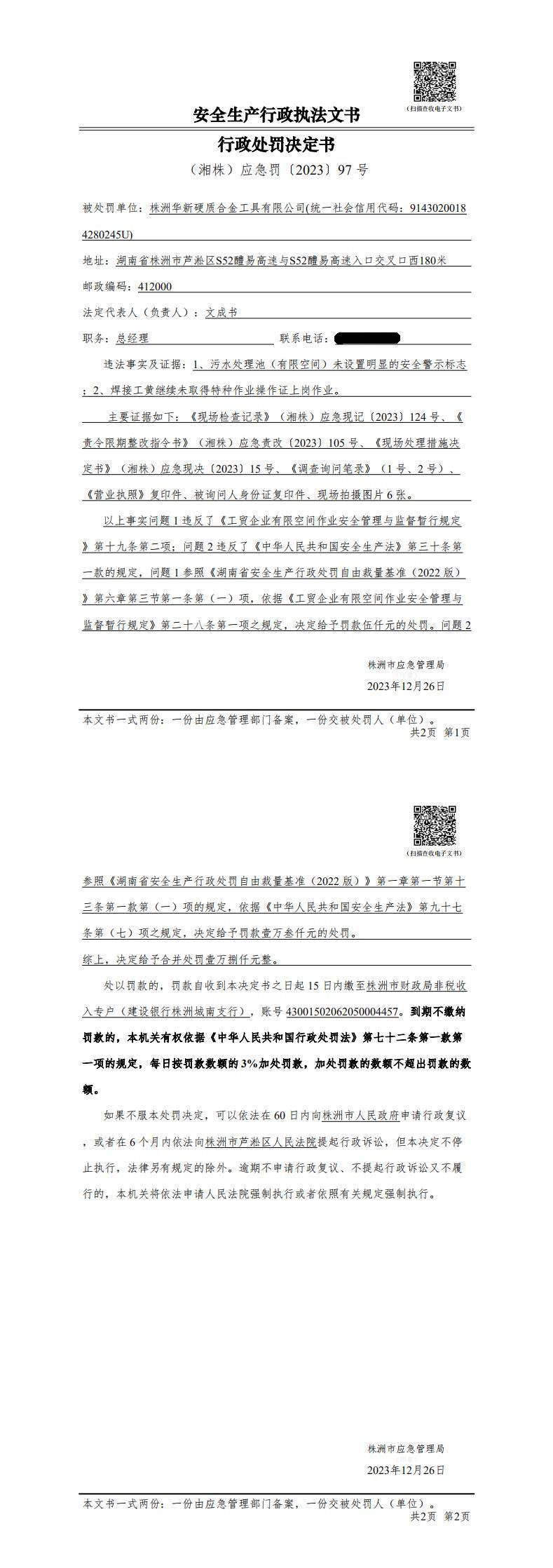 株洲华新硬质合金工具有限公司行政处罚决定书