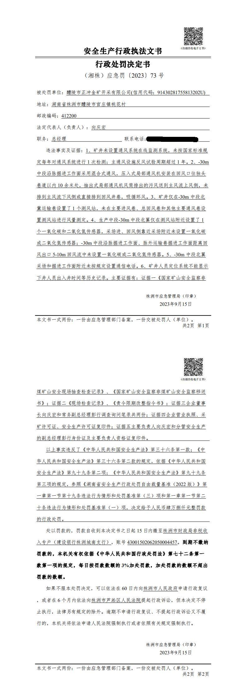 醴陵市正冲金矿开采有限公司行政处罚决定书
