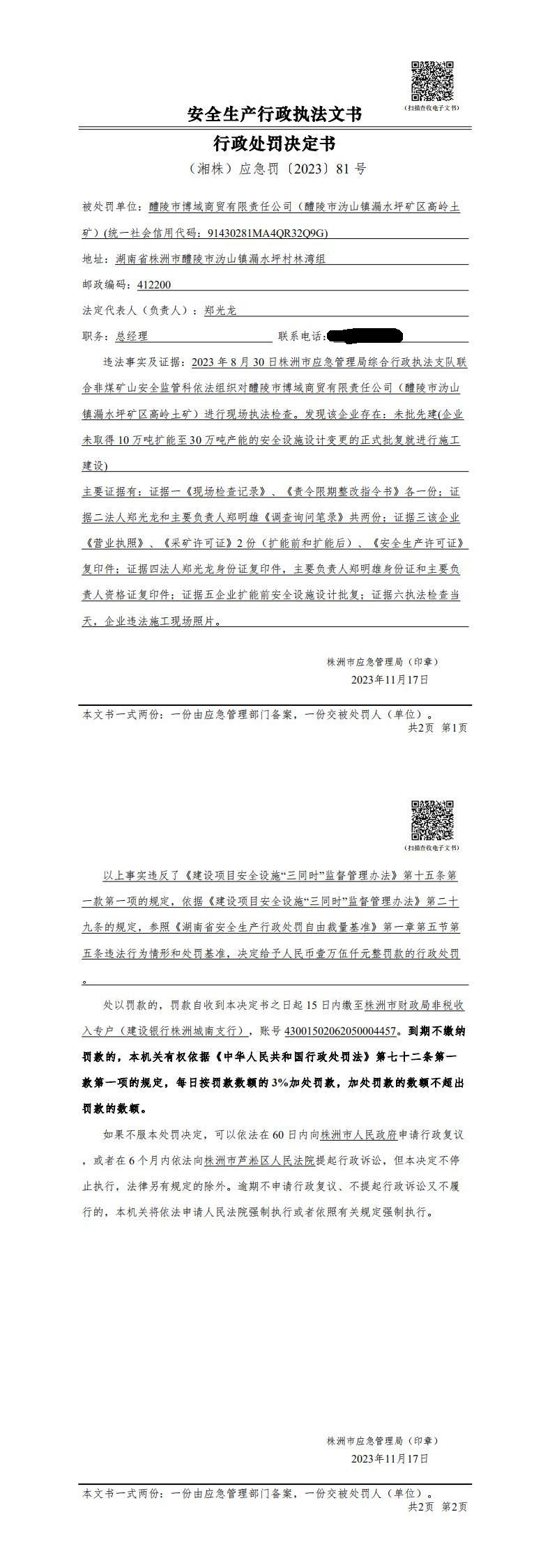 醴陵市博域商贸有限公司行政处罚决定书