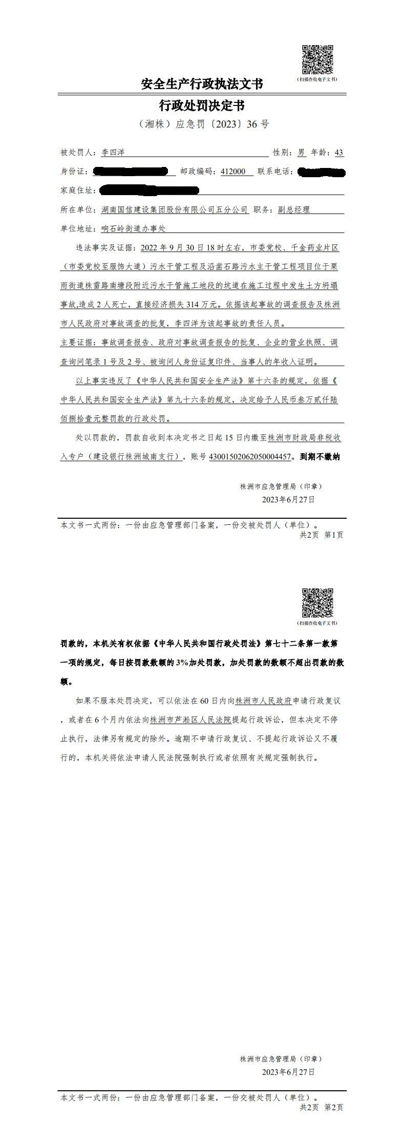 湖南国信建设集团股份有限公司五分公司行政处罚决定书(对个人)