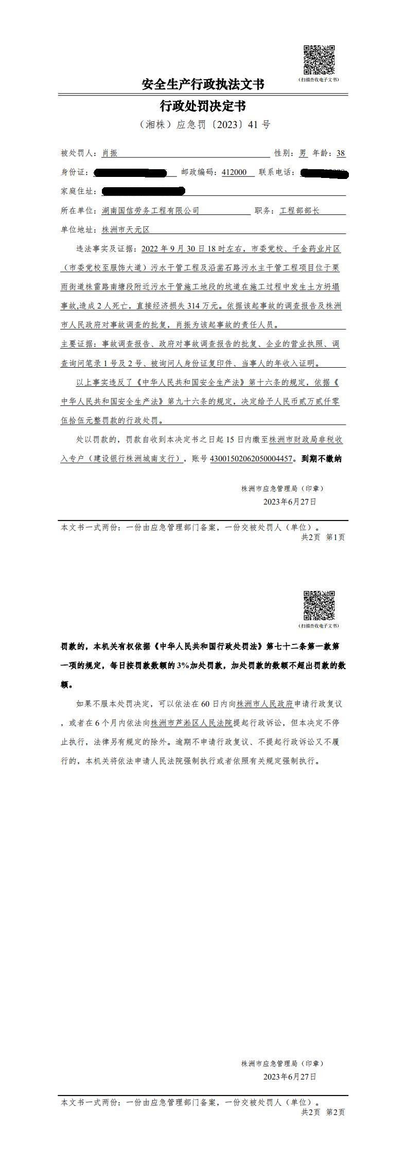 湖南国信劳务工程有限公司行政处罚决定书(对个人)