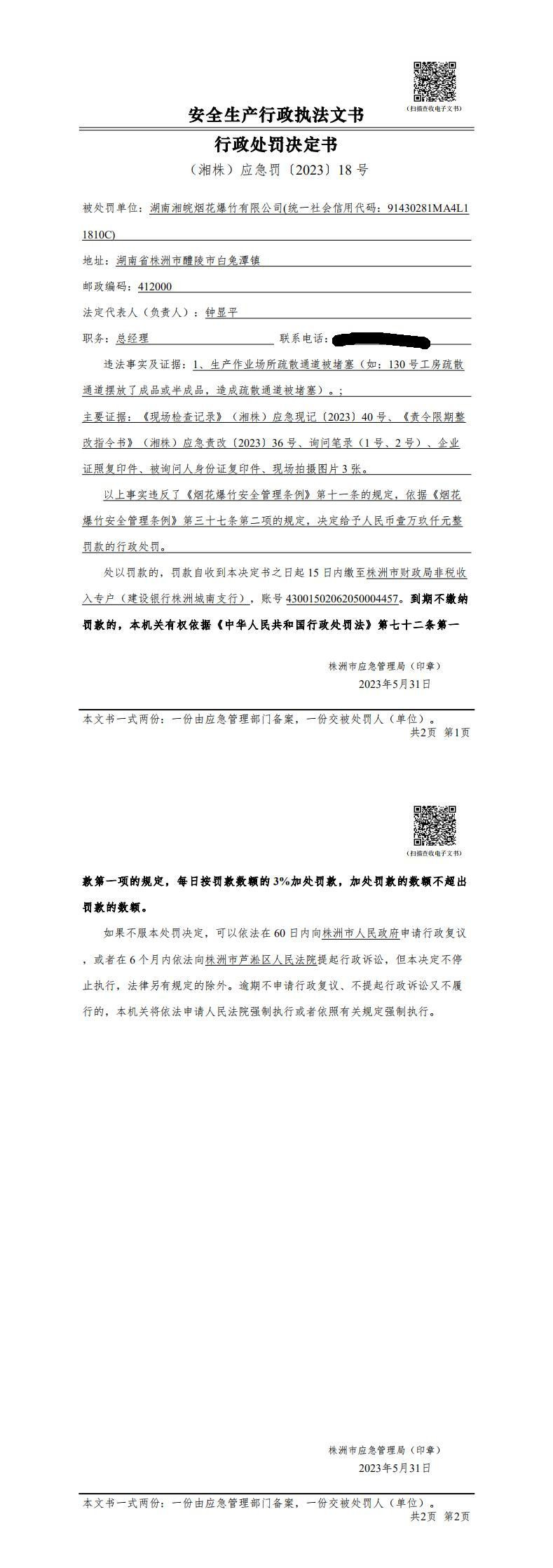 湖南湘皖烟花爆竹有限公司行政处罚决定书