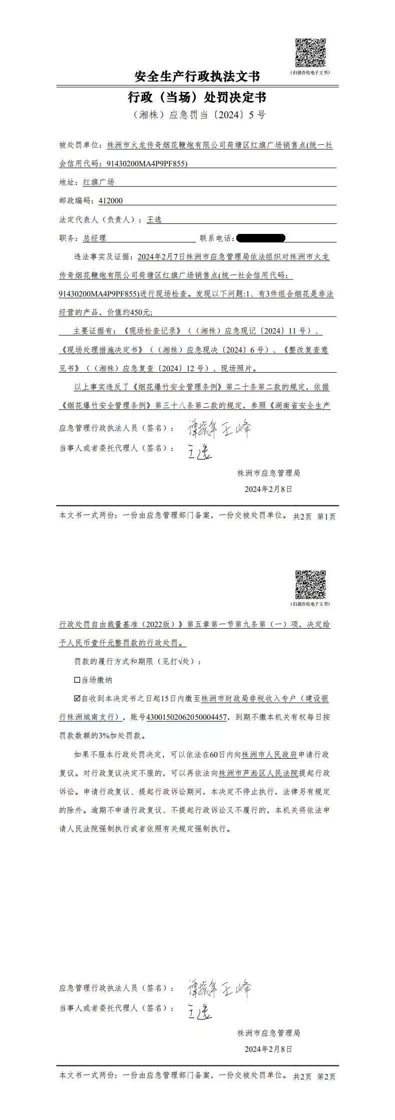 株洲市火龙传奇烟花鞭炮有限公司荷塘区红旗广场销售点行政处罚决定书