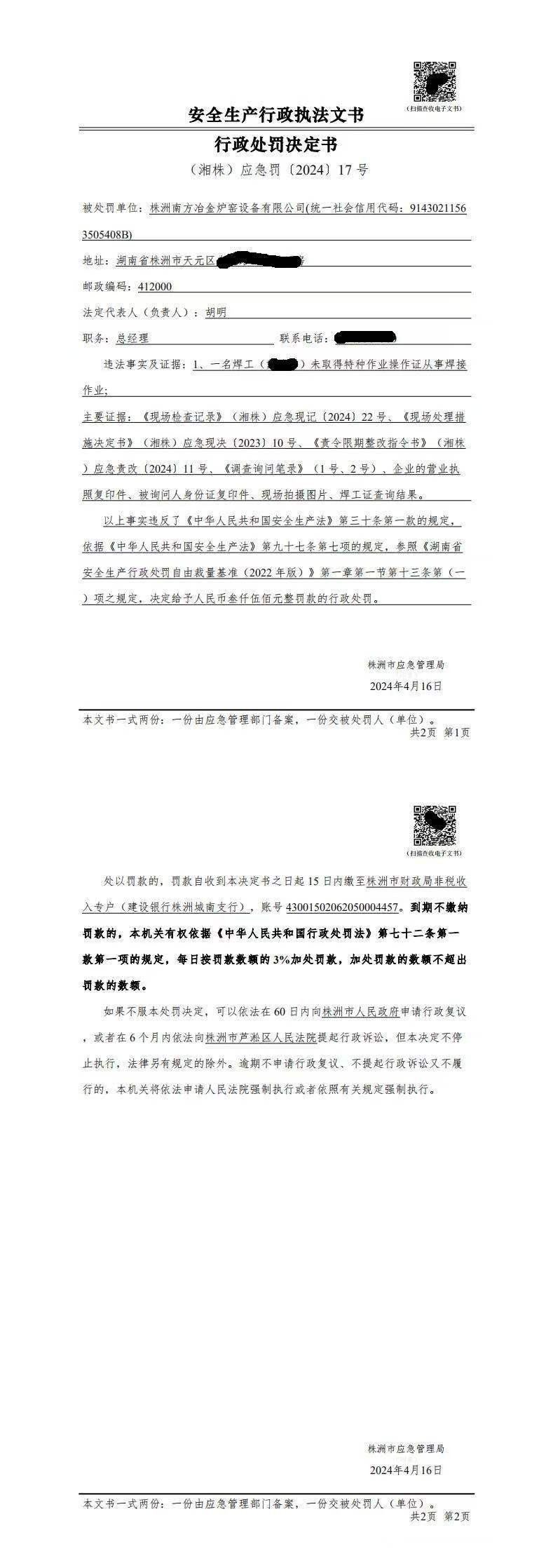 株洲南方冶金炉窑设备有限公司行政处罚决定书