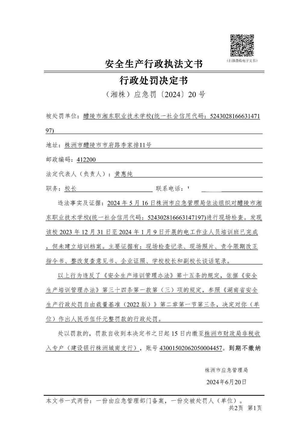 醴陵市湘东职业技术学校行政处罚决定书