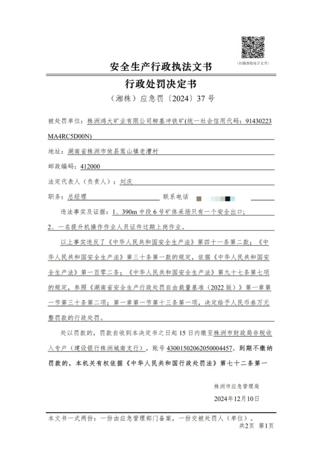 株洲鸿大矿业有限公司柳基冲铁矿行政处罚决定书