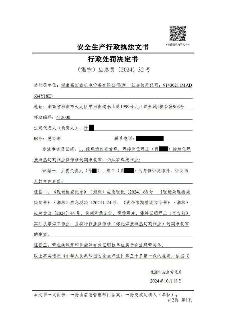 湖南嘉宏鑫机电设备有限公司行政处罚决定书