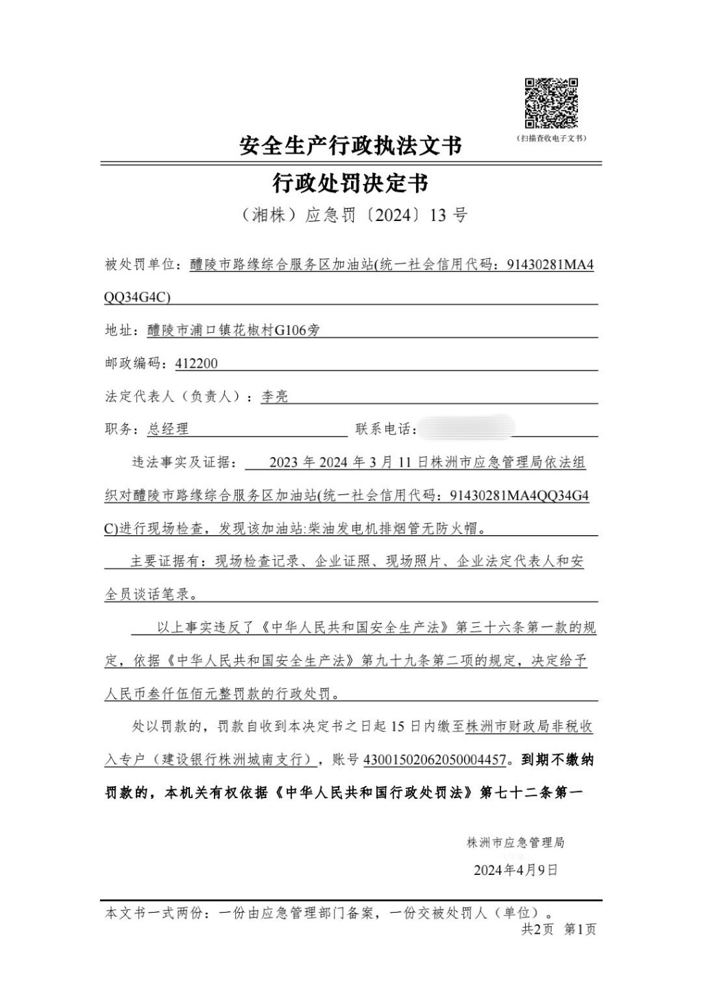 醴陵市路缘综合服务区加油站行政处罚决定书