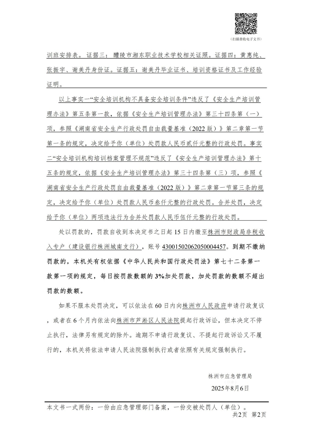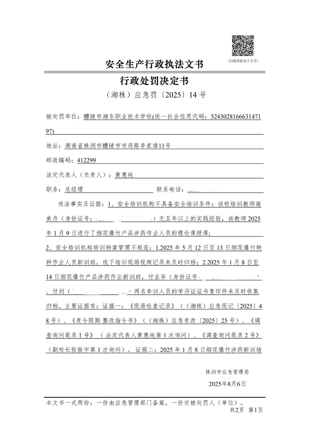 醴陵市湘东职业技术学校行政处罚决定书