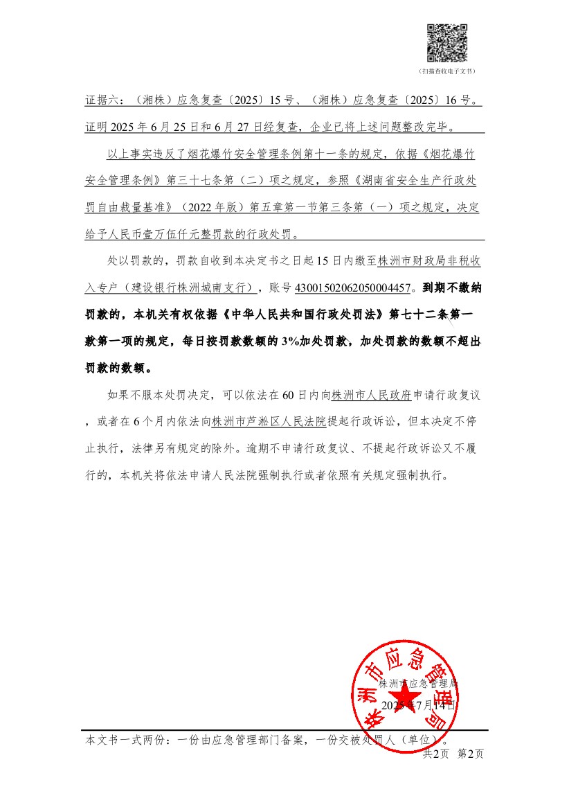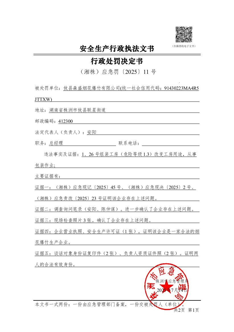 攸县森盛烟花爆竹有限公司行政处罚决定书