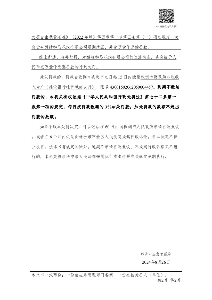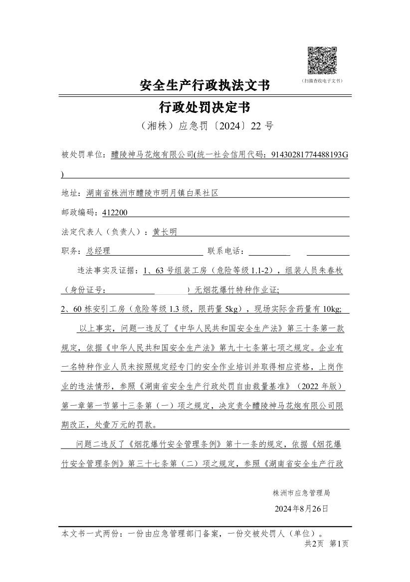 醴陵神马花炮有限公司行政处罚决定书