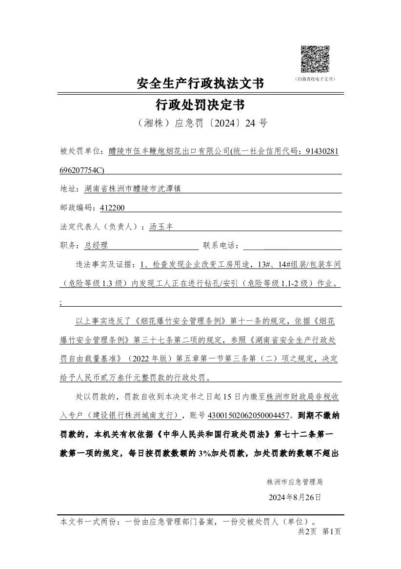 醴陵市伍丰鞭炮烟花出口有限公司行政处罚决定书