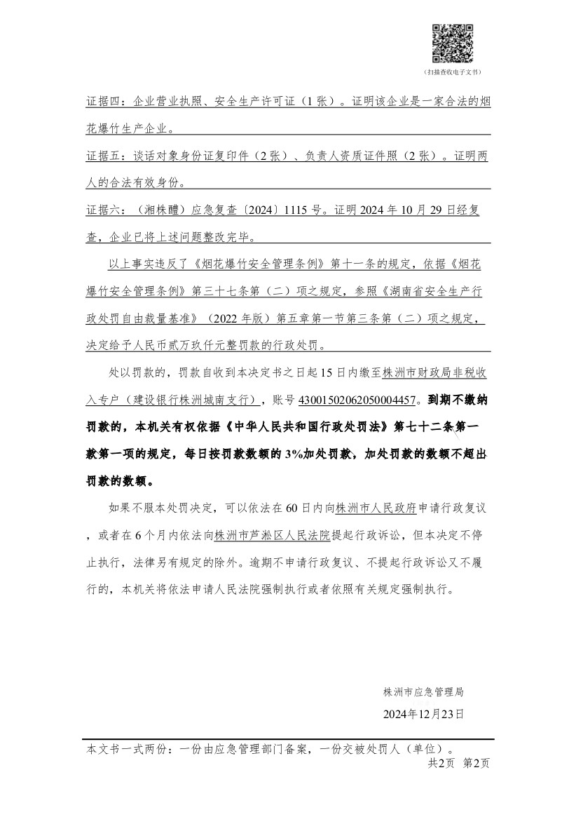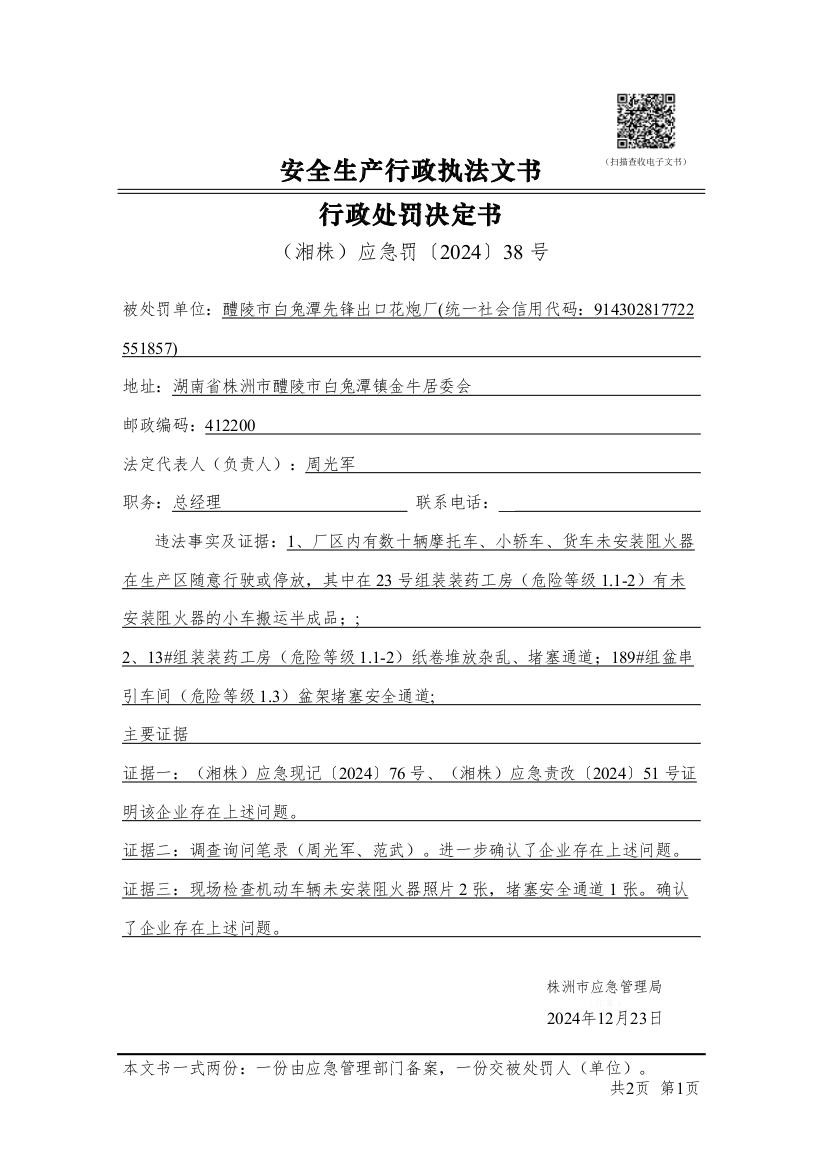 醴陵市白兔潭先锋出口花炮厂行政处罚决定书
