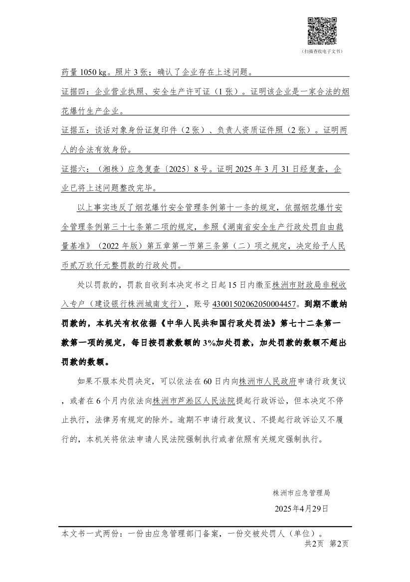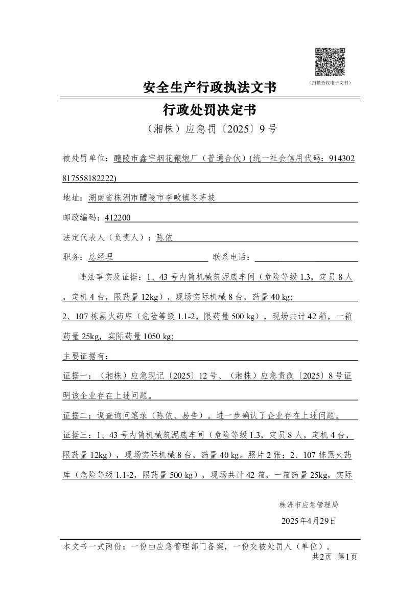 醴陵市鑫宇烟花鞭炮厂行政处罚决定书