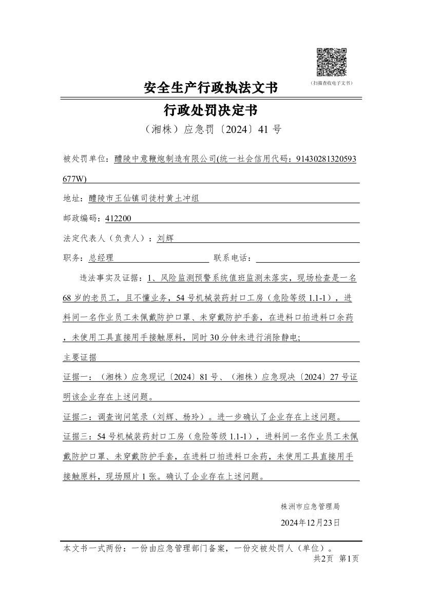 醴陵中意鞭炮制造有限公司行政处罚决定书
