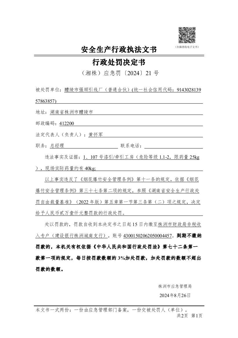醴陵市强顺引线厂行政处罚决定书